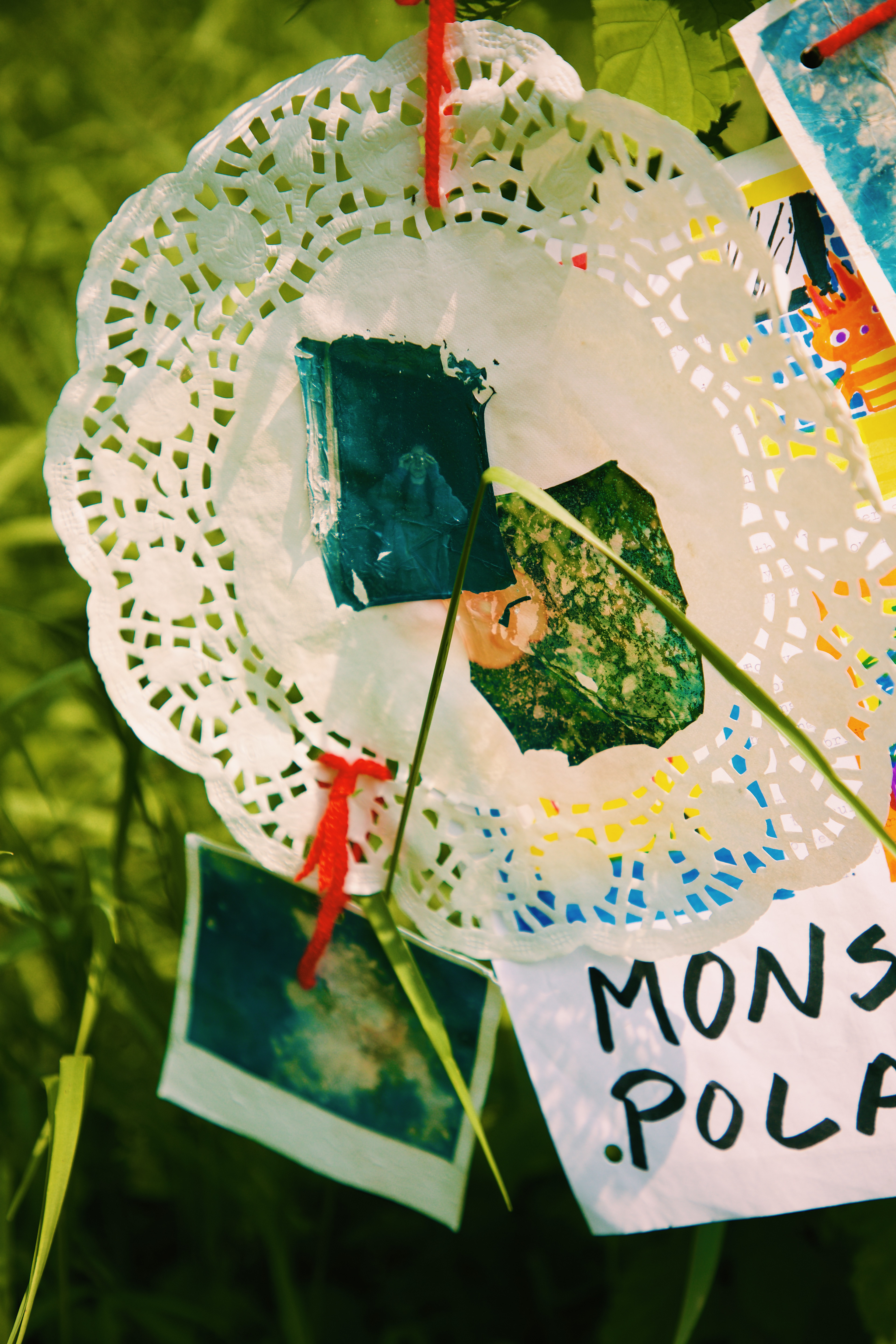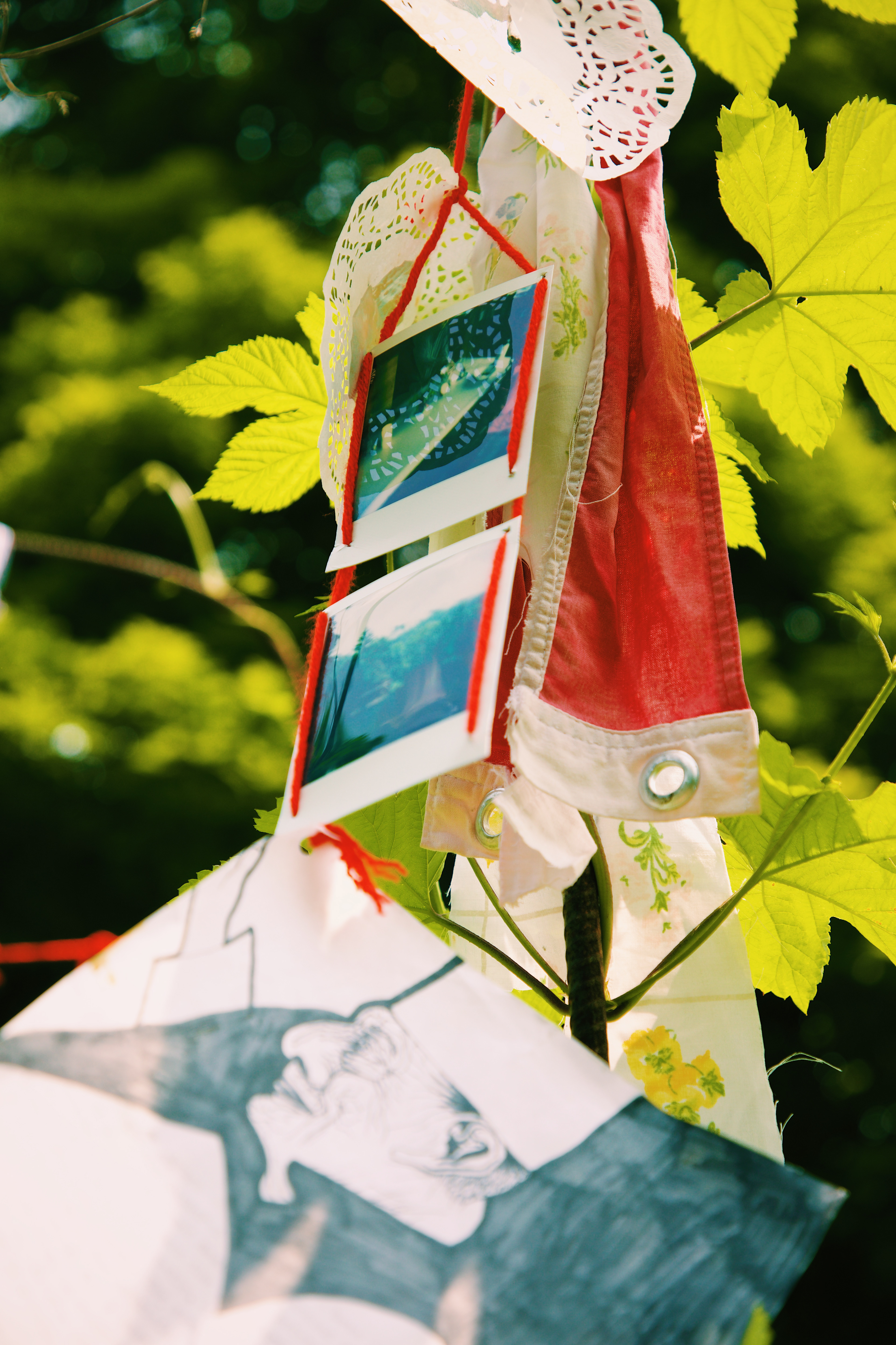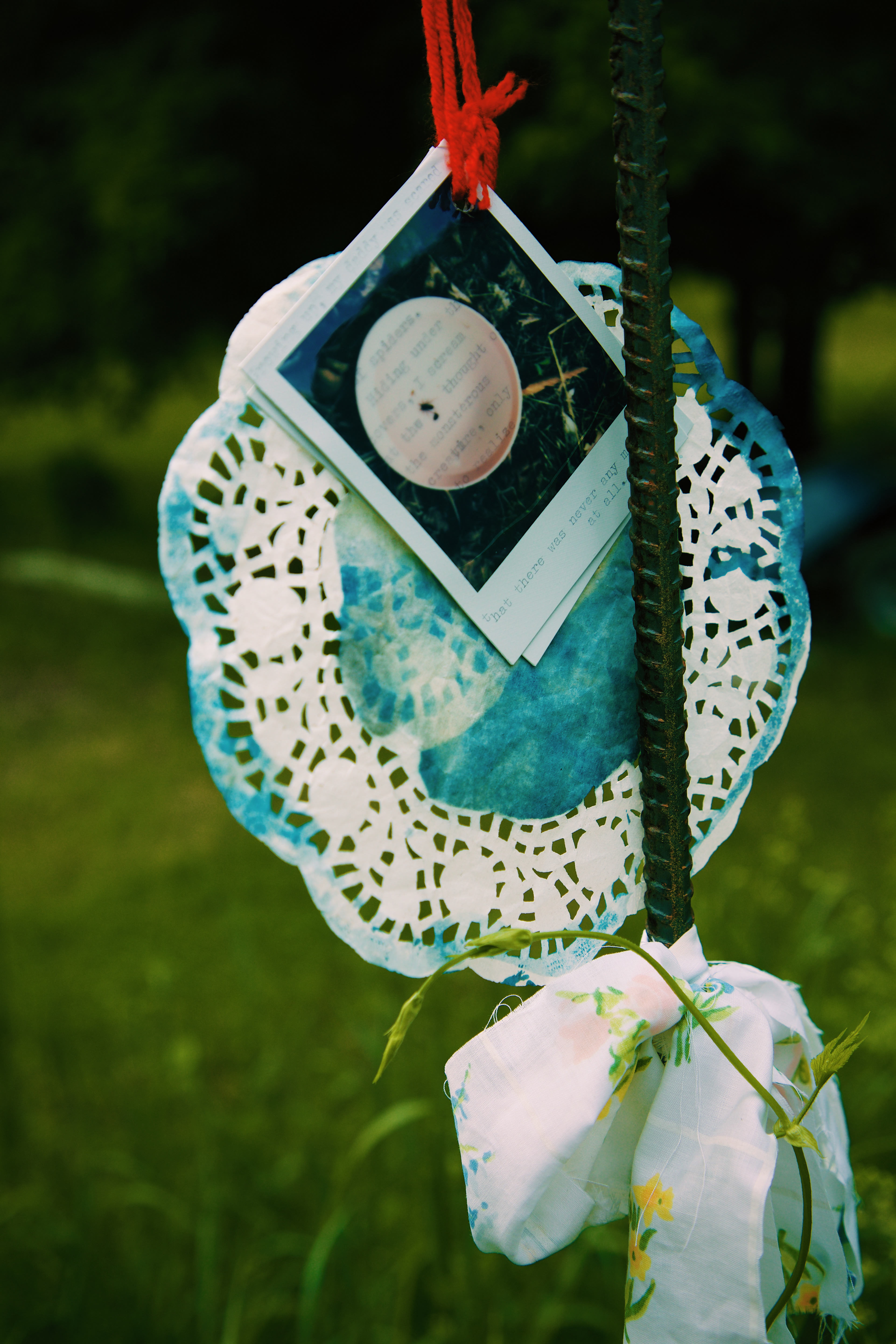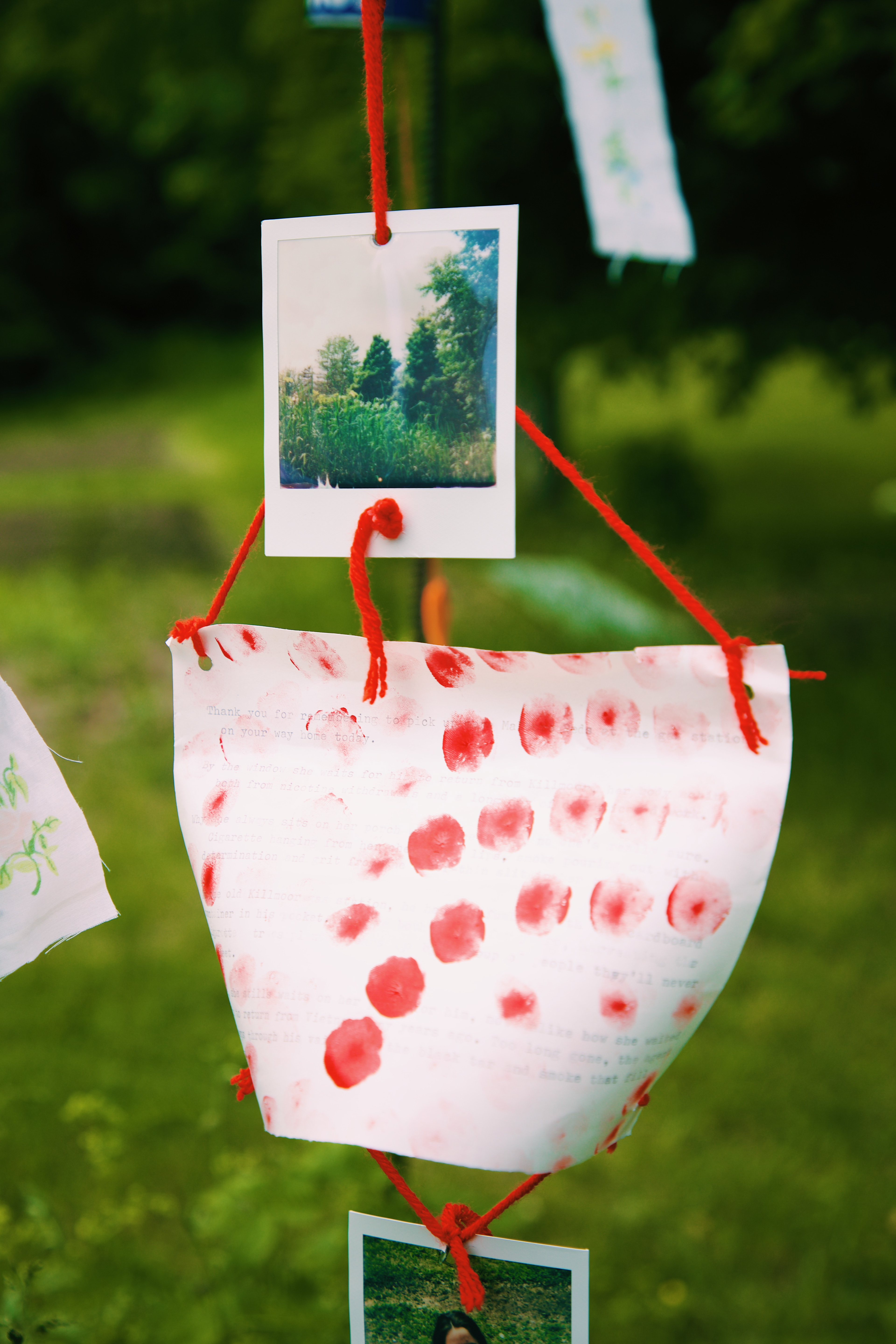 I invited the viewer to interact with the space and the strings in a very hands-on fashion - bend, reach, stand on your tip-toes, lean with the wind to see the combination of polaroid prints, emulsion lifts, cyanotype prints, and written word on found archival stationery.
